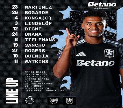 阿斯顿维拉首发:23-达米安-马丁内斯、26-博加德、4-孔萨、3-林德洛夫、12-迪涅、24-阿马杜-奥纳纳、8-蒂勒曼斯、19-桑乔、27-摩根-罗杰斯、10-布恩迪亚、11-沃特金斯