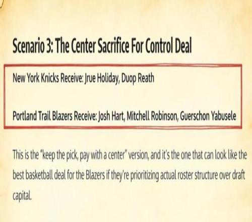 美媒《Fadeaway World》则撰文提出了一套3换2的交易方案,建议尼克斯送出哈特、罗宾逊和亚布塞莱,从开拓者引入霍勒迪以及里斯。